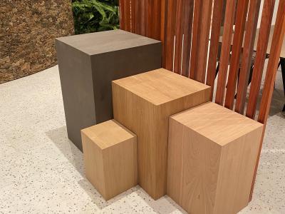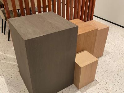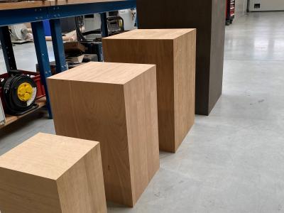 Voor een showroom maakten we blokken, gebruikt als decoratie en zitbankjes, uit verschillende houtsoorten. De wand bekleedden we met padoek balkjes en natuurlijke elementen zoals kurk en eiken latjes voor een warm en gezellig effect.