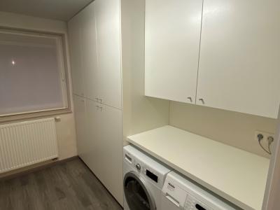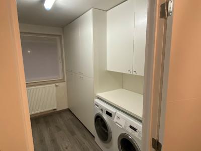 Voor deze wasplaats ontwierpen we kasten op maat en een handige opvouwtafel.